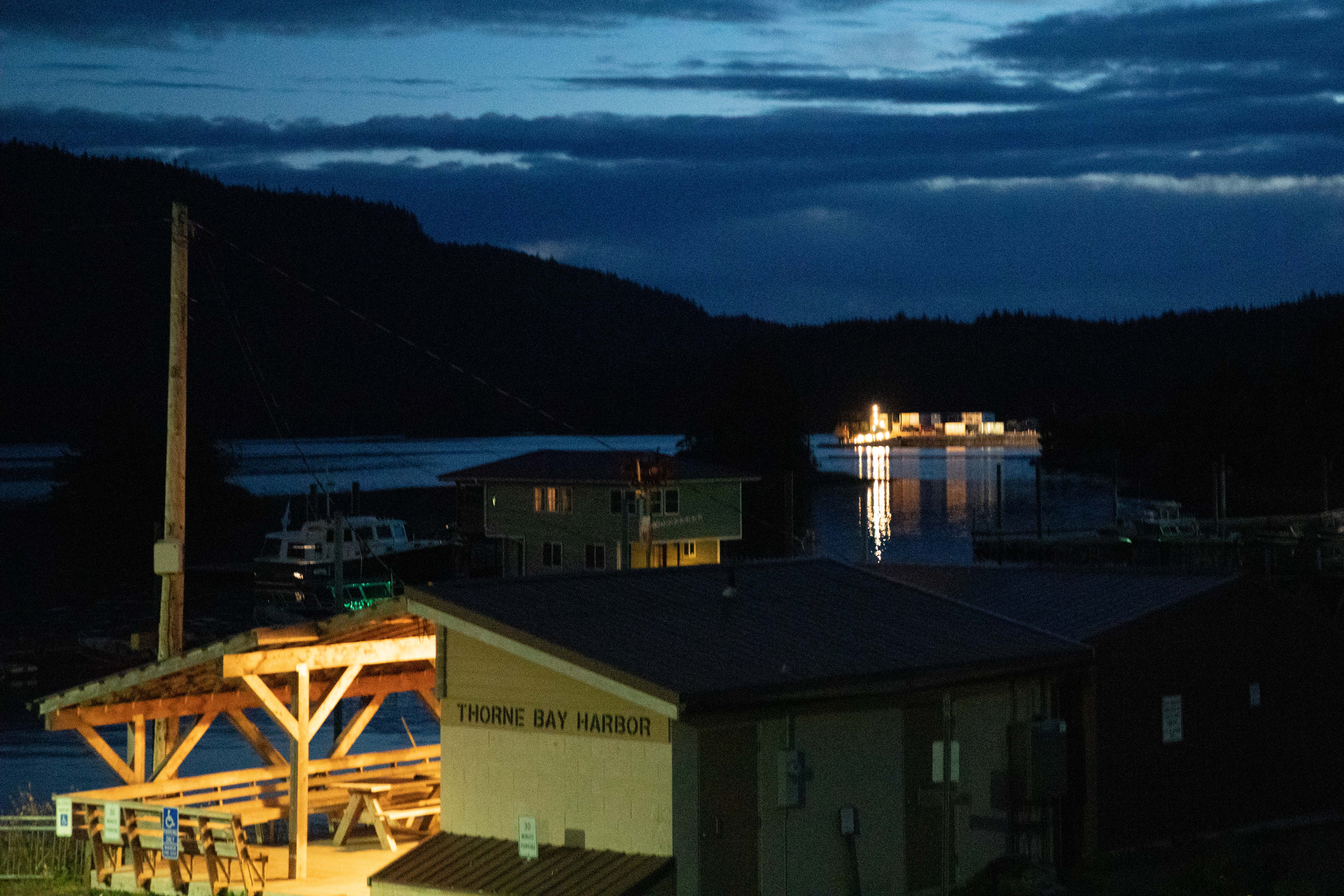 In the background in the photo below, you can see the lit-up barge that brought us our truck, trailer and earthly belongings, coming into harbor safe and sound!