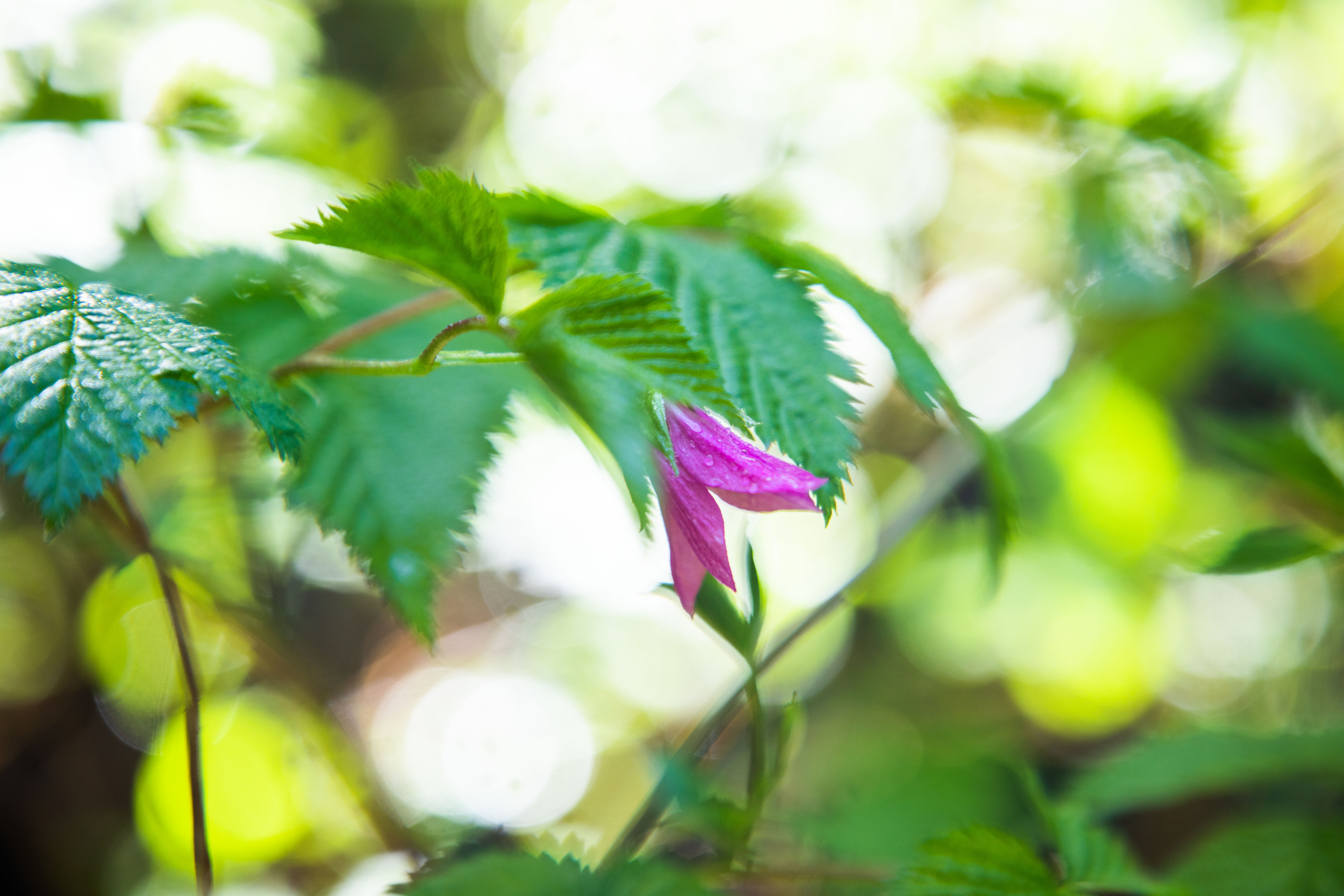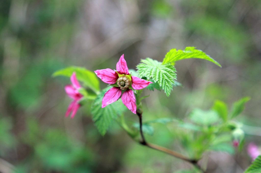 Salmonberries blossom early, and they are a delightful shade of pink!