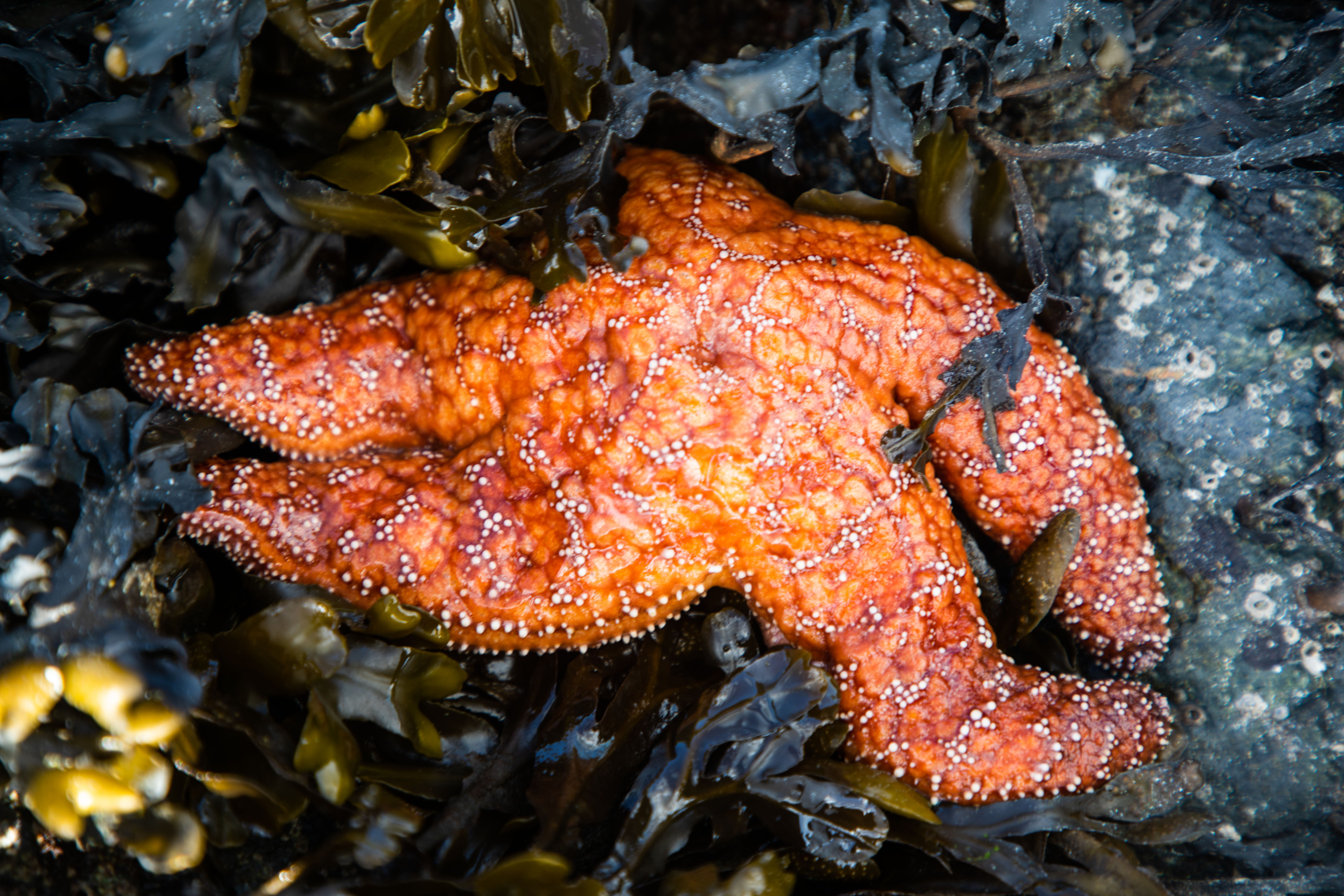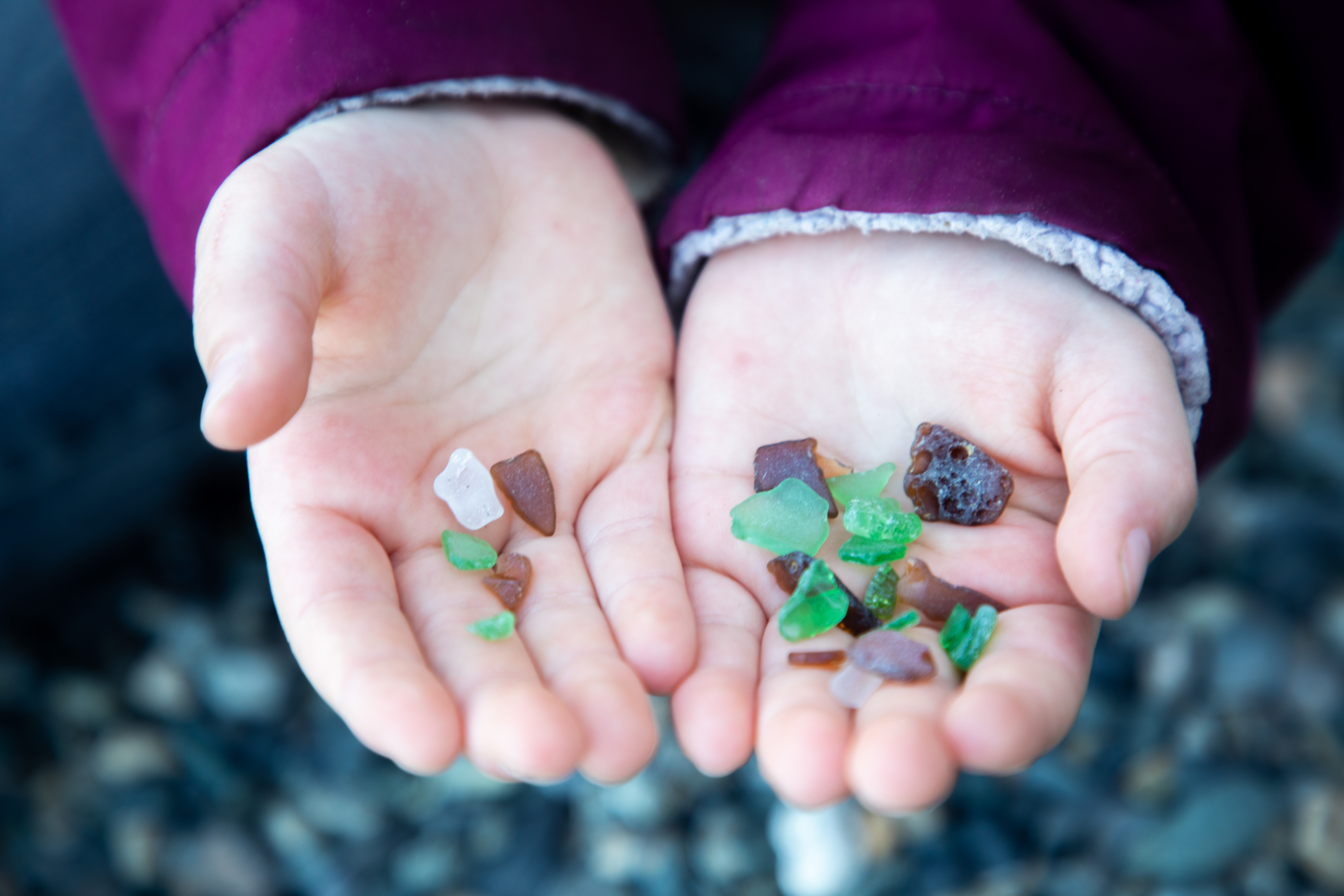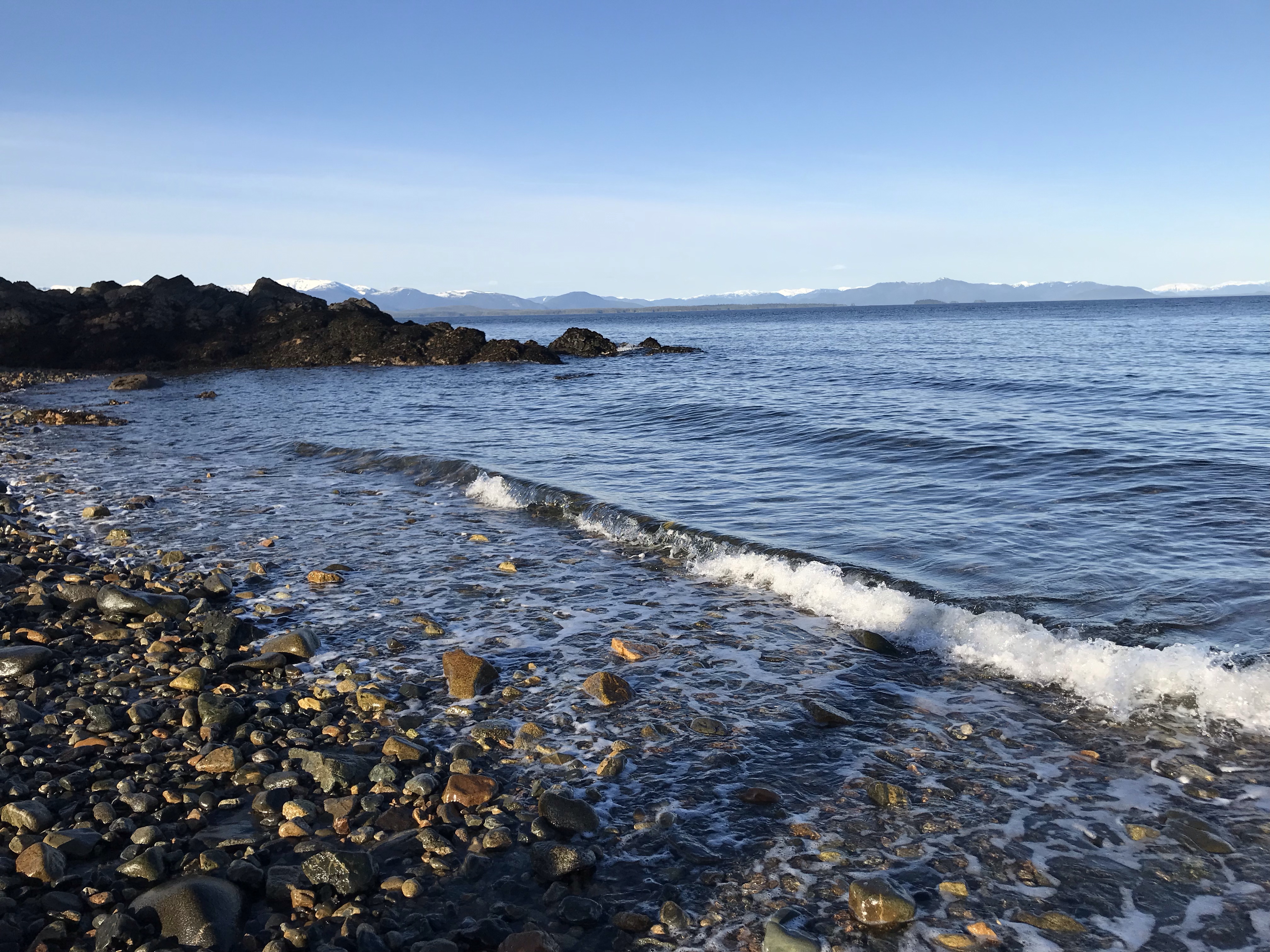 I needed the sound of the waves more than I realized. Picking my way along the beach in search of colors and shapes and forms of life, a slow and silent pastime, was incredibly restful and rejuvenating. Far out, flashing rich brown against the blue, two sea lions were traveling south, and up the shore a few friends gathered peacefully around a crackling fire of driftwood, contentedly watching the sun turn the snowy peaks across the strait pink as it sank in the west.