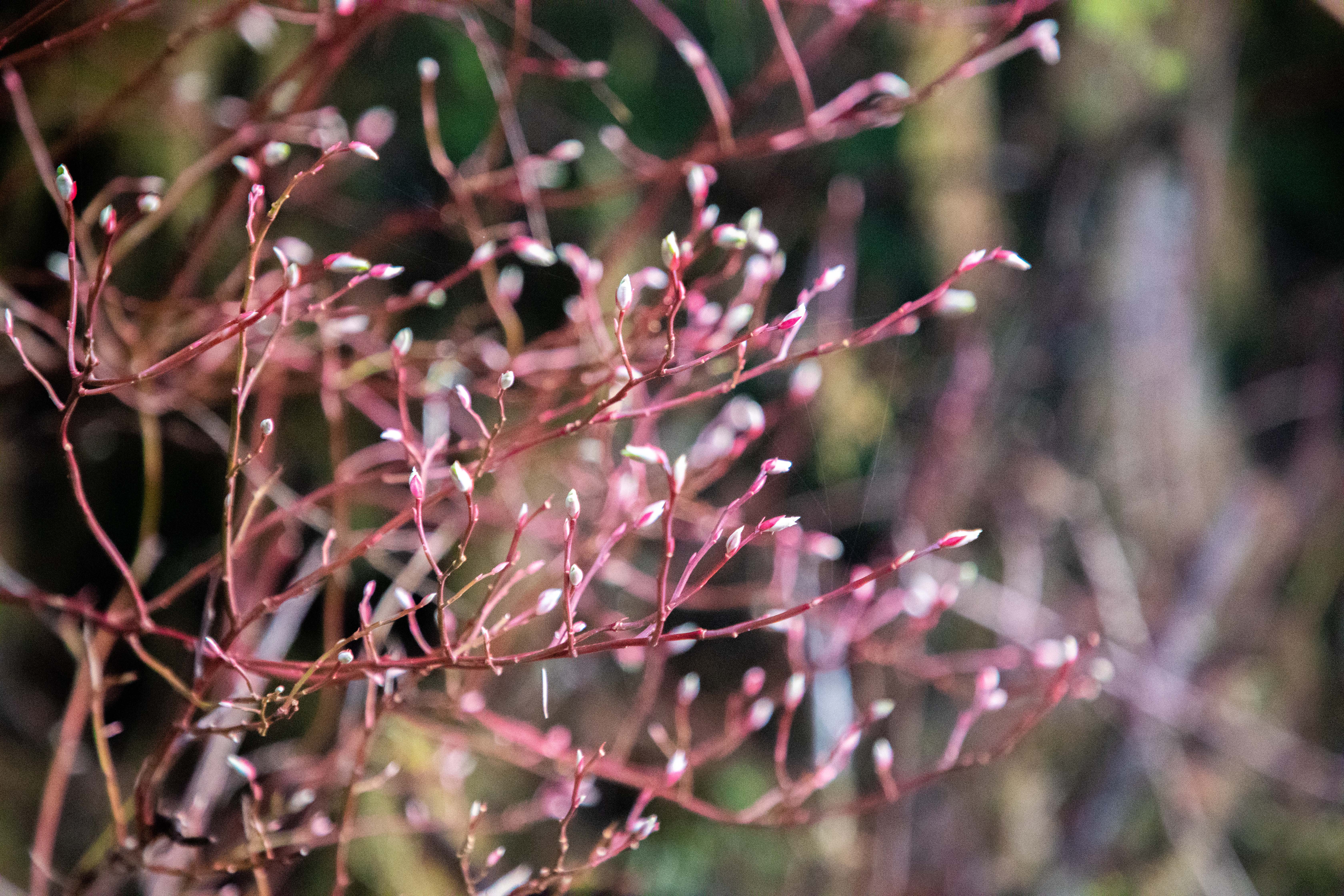 But in the golden hour of this glorious clear spring day, when the last rays of the sunshine were slanting low along the singing water and through the stately cedars, I saw the huckleberry bushes in all their fairytale spring glory for the first time.
