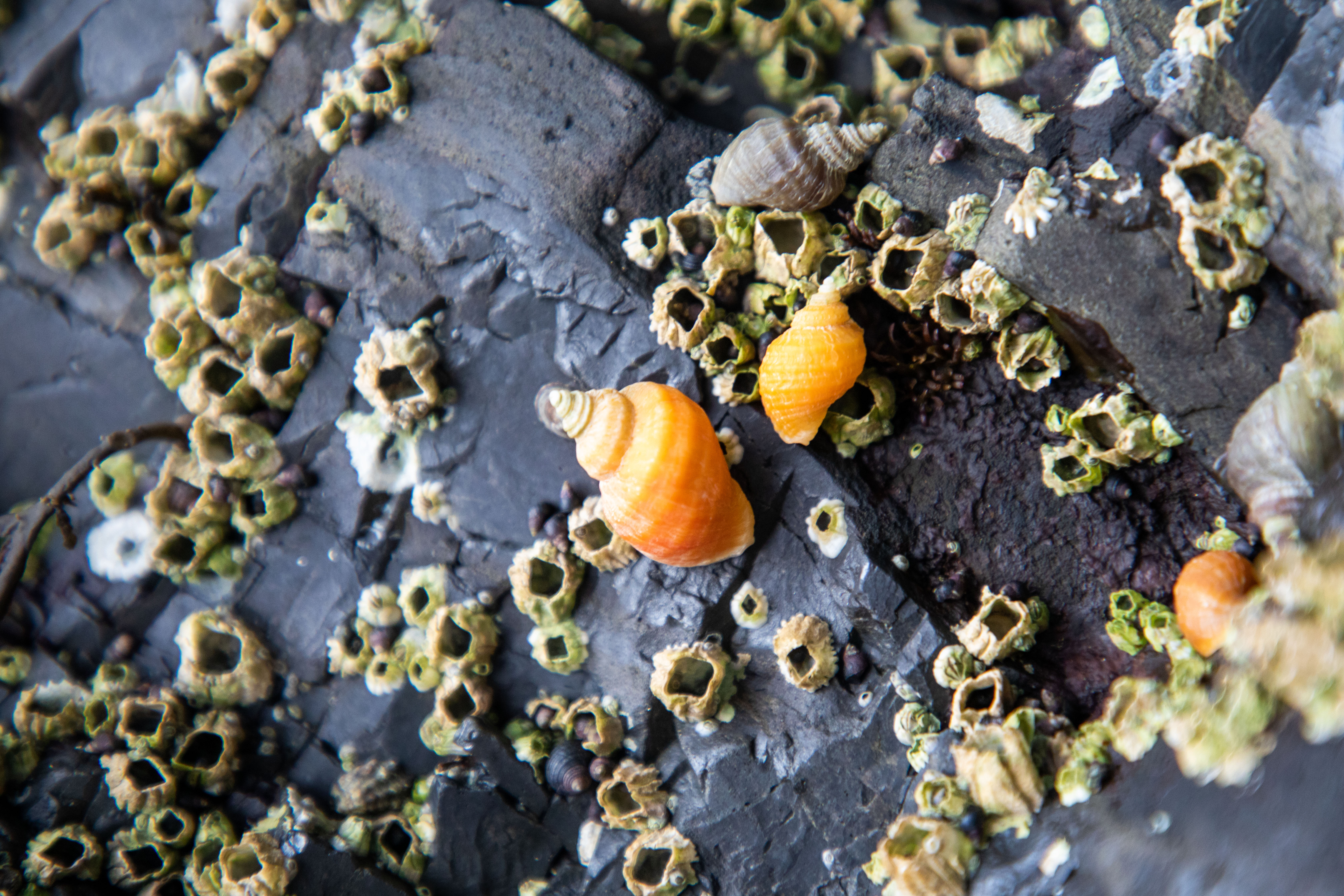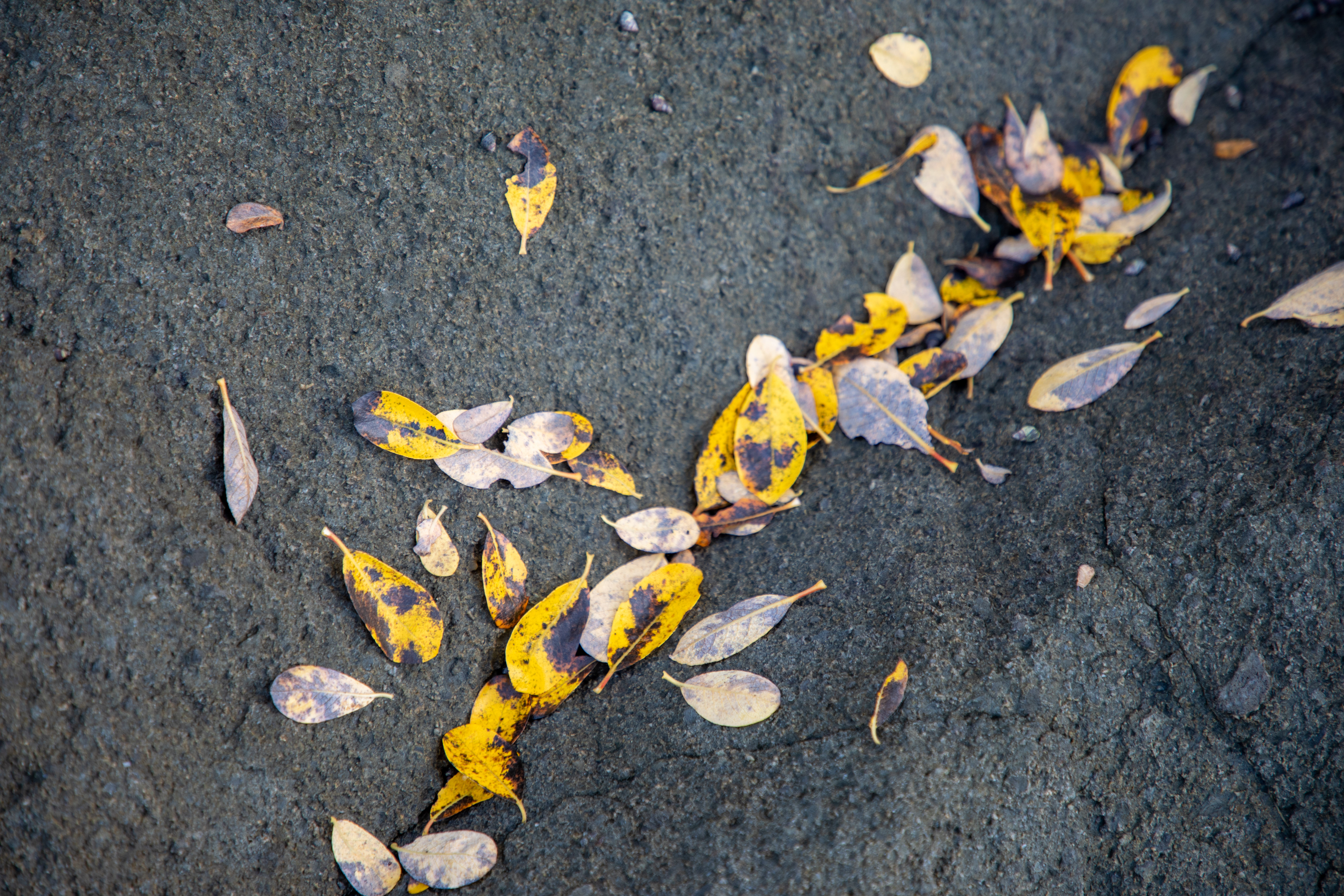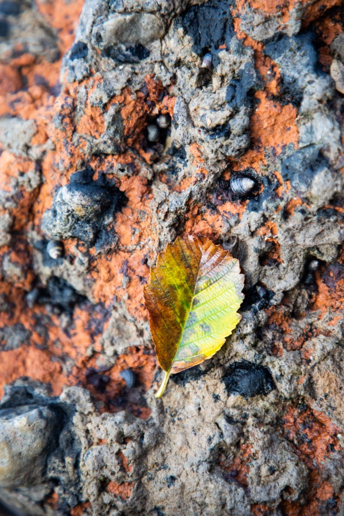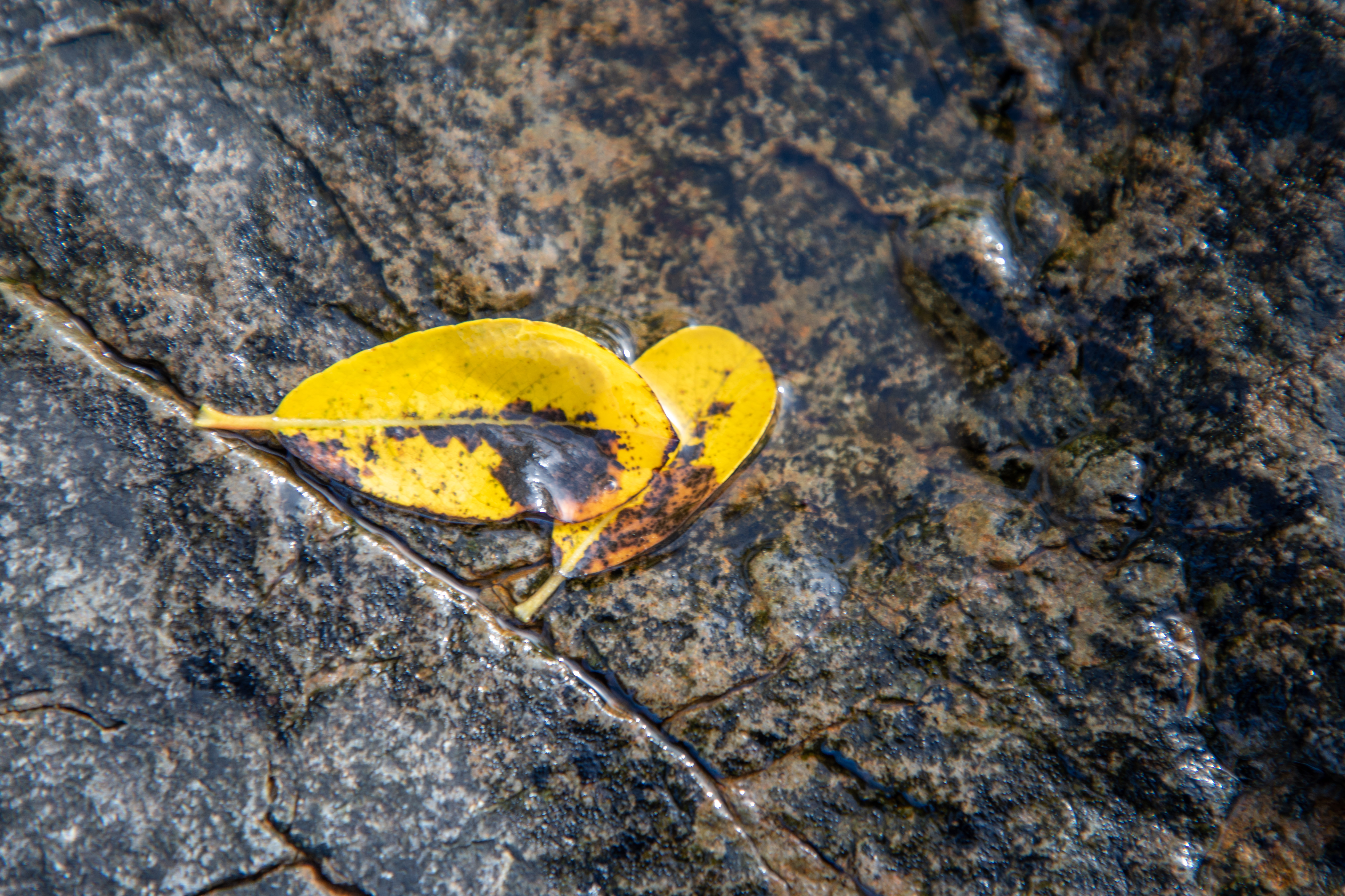 I found these little yellow leaves dotting the boulders of a beach this last week, falling like confetti from shrubs along the shore.