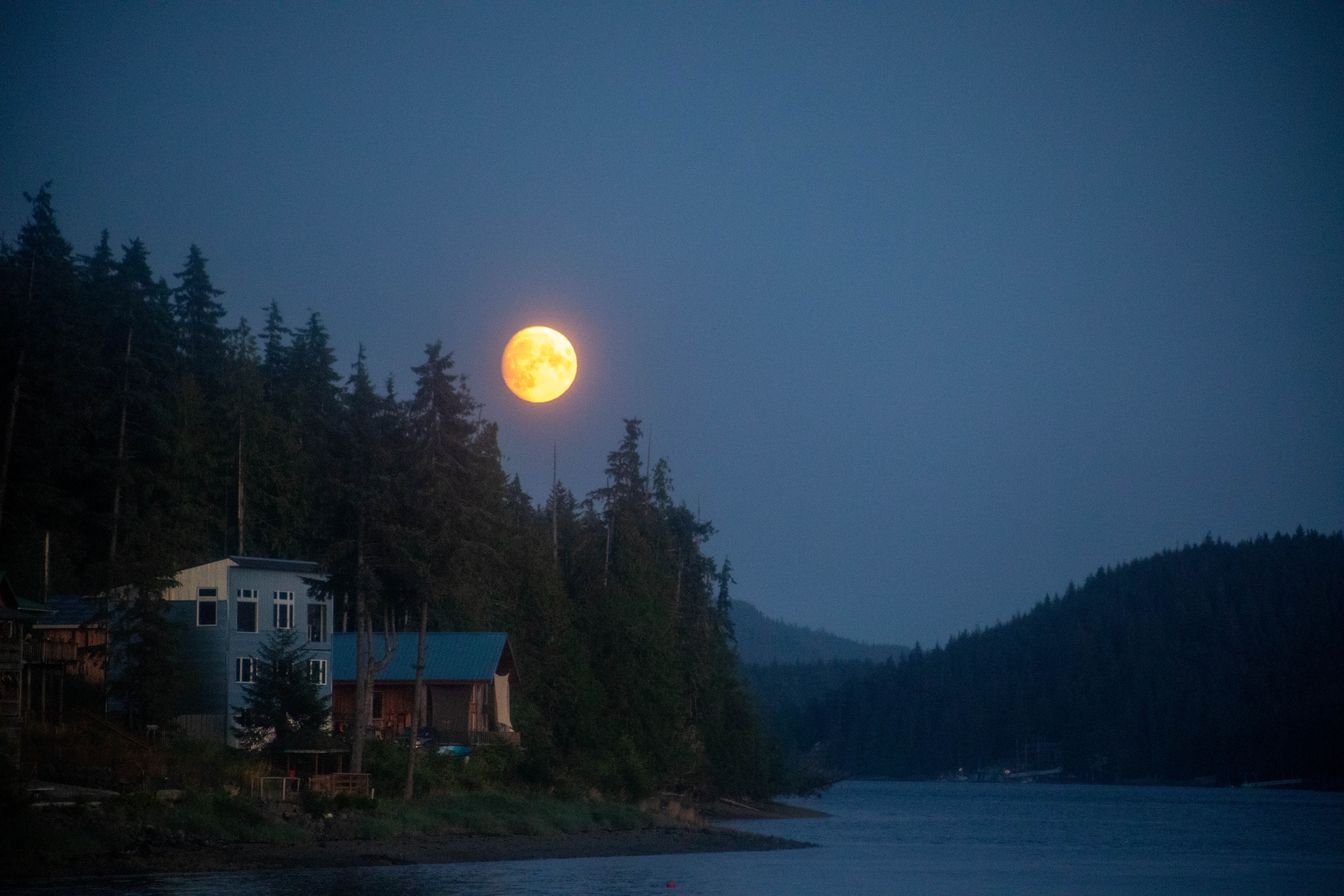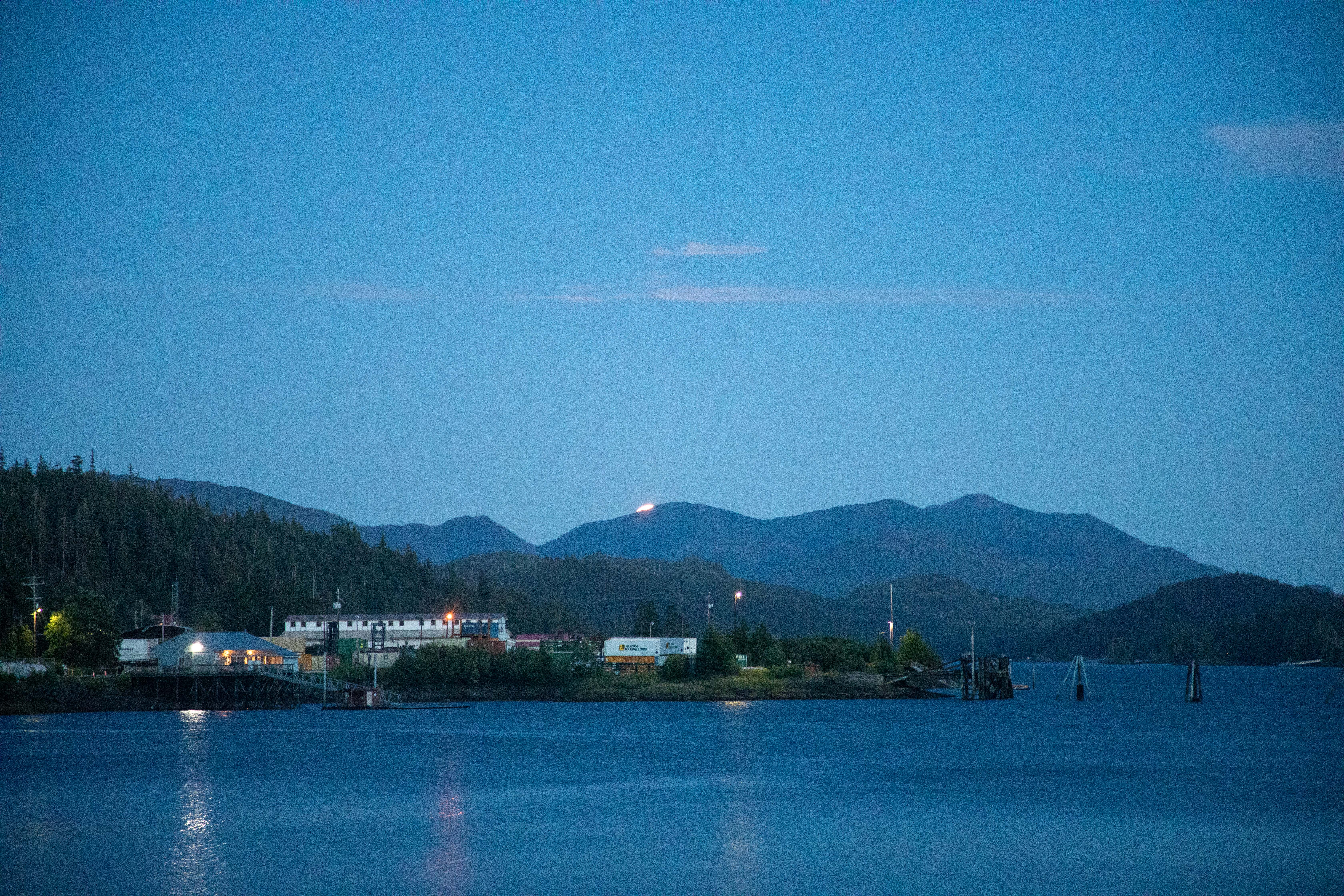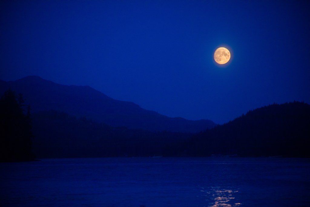 Here in southeast Alaska, I’m told the Haida call the full moon of August the “Salmon Moon”, and the Tlingit call it “Berries-Ripe-On-Mountain Moon” (Incidentally, the Haida July moon is “Ripe Berry Moon” and the Tlingit July moon is “Salmon Moon”!). Both names certainly make sense! This week, we were blessed with night after night of clear skies to watch the moon rise. The thimbleberries were at their peak of ripeness, and my fingers were bright red by the time I’d picked enough for a batch of jam.