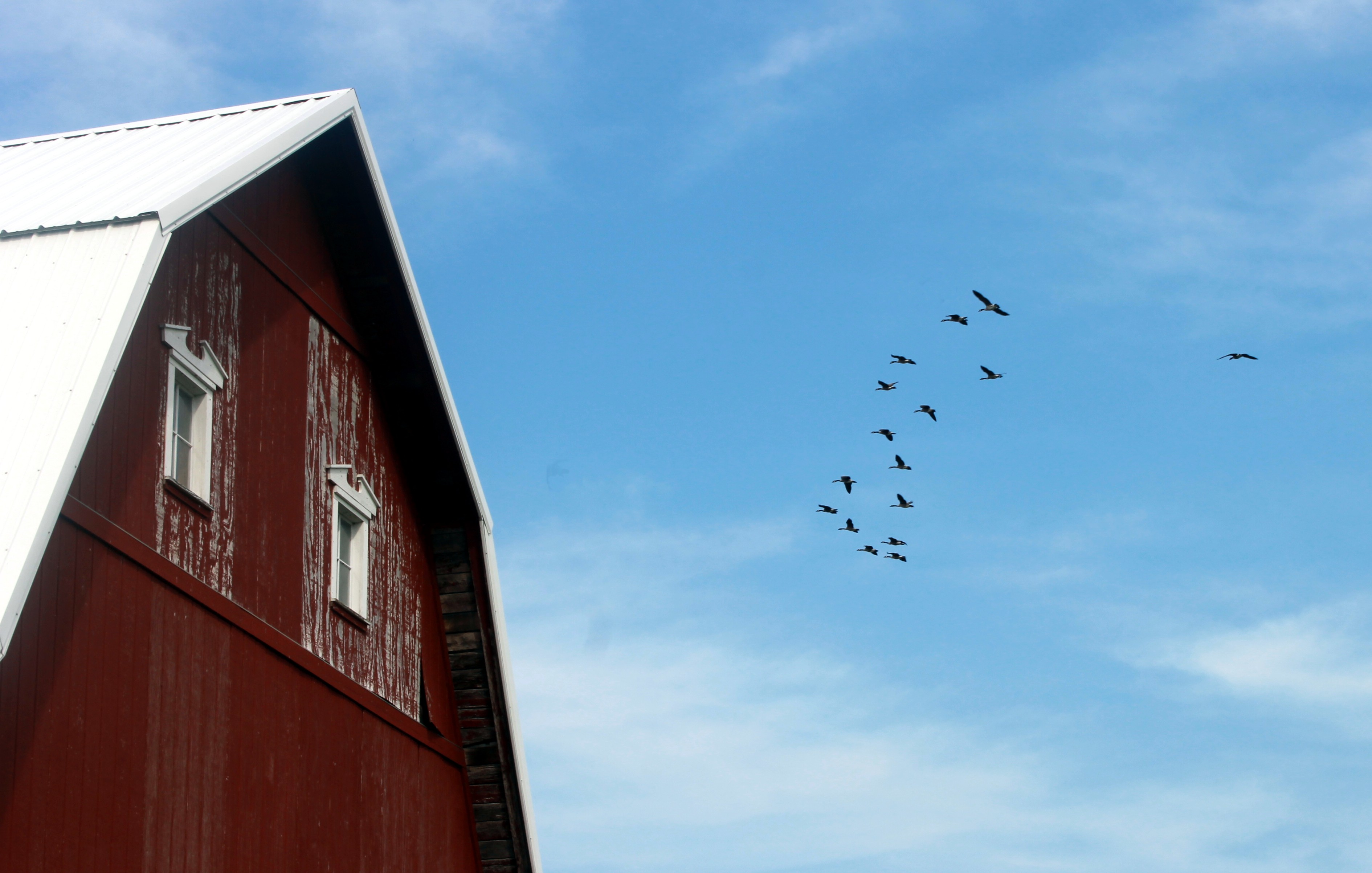 geese in a row / rejoicing hillsThese days, the skies around our farm are alive with action.  All the little goslings have grown up, and are hard at work in flight school, taking lessons in formation and technique from their elders.  They wheel around the barn, descending to the gentle hills in the hay field;  they rise in great clouds and move off towards the corn fields.  The echo of wings flapping against the surface of the lake is steady all day long as they practice syncing their watery takeoffs and landings over and over again.  And all of this, of course, to the music of autumn, a grand symphony (or cacophony, some might say) of honking.barn and flying geese / rejoicing hillsI love it.